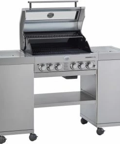 Der Gasgrill verfügt über 4 Flammen, einen Seitenkocher, zwei Grillroste aus Gusseisen und über eine obere Ablage zum Warmhalten. Der Grill wird anschlußfertig mit Gasschlauch und Druckminderer geliefert.
