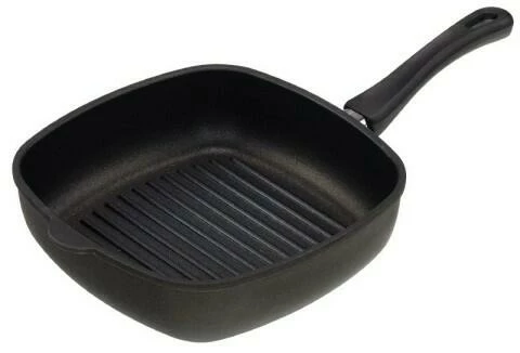 AMT Eckpfanne hoch aus Aluguss mit Stielgriff und Grillstreifen. Die quadratische Form bietet mehr Platz zum Braten von Kotellets, Schnitzeln oder Spießen. Der Grillboden sorgt für die grilltypischen Streifen auf dem Bratgut. Das Werkzeug der Deutschen Köche-Nationalmannschaft.