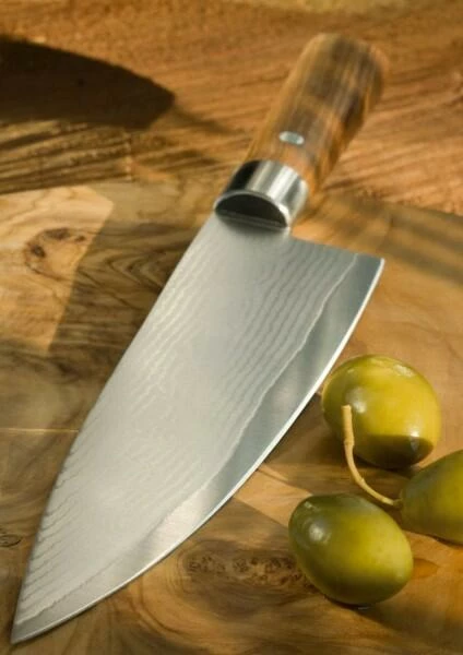 Damast Olive Kochmesser mit ausgesuchten Olivenholzgriffen die passende Ausrüstung für die Küche dar. Das Holz wird handverlesen, um zu garantieren, dass ausschließlich die besten Stücke verwendet werden – passend zu den rasiermesserscharfen