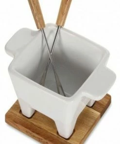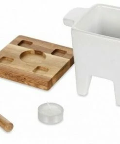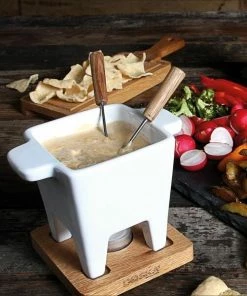 - Käsefondue-Set bestehend aus Käsefonduetopf aus Steingut, Eichenholzbrett, 2 Edelstahl-Gabeln und einem Teelicht