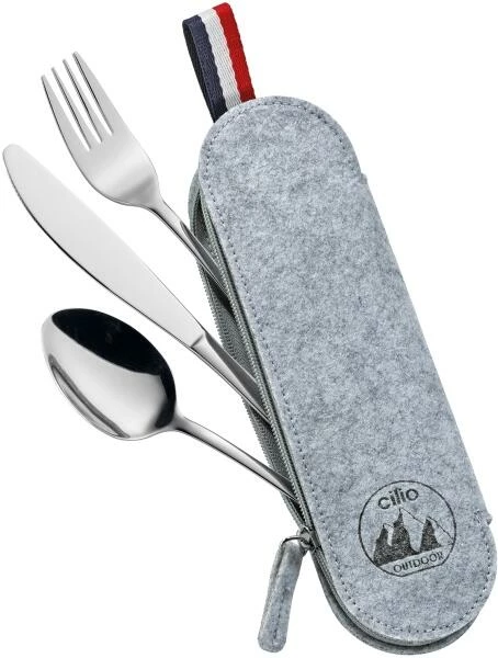 Mit dem dreiteiligen Besteckset sind Sie immer nützlich ausgestattet unterwegs. Die handgerechte Filztasche mit Reißverschluss und Griff bewahrt Messer, Gabel und Löffel ideal in Ihrem Rucksack oder ihrer Tasche auf. Essen sie wo es schön ist, ganz egal wo. Das cilio Besteckset VIAGGIO läd Sie dazu ein.