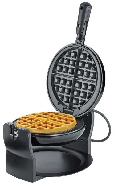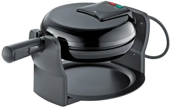 Das Waffeleisen ist drehbar und somit ist ein perfektes und gleichmäßiges Ergebnis garantiert. Die Teigauffangschale ist herausnehmbar und leicht zu reinigen. Der Griff ist zur platzsparenden Aufbewahrung einklappbar und die Backplatten sind antihaftbeschichtet, rund und haben einen Durchmesser von 17 Zentimeter. Es gibt jeweils Kontrolllampen auf Vorder- und Rückseite des Waffeleisens und im Lieferumfang ist außerdem ein kleines Rezeptheft enthalten.