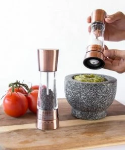 Die hochwertige Derwent Pfeffer-und Salzmühle aus kupferfarbenem Edelstahl und Acryl gehört zu unseren bekanntesten und beliebtesten Gourmet-Präzisionsmühlen. Die Mühle verfügt über ein Gourmet-Precision+ Mahlwerk aus gehärtetem Karbonstahl mit 6 voreingestellten Mahlstufen (Pfeffer) und aus Keramik mit 3 voreingestellten Mahlstufen (Salz) von fein bis grobkörnig. Drehen Sie dazu einfach am entsprechenden Edelstahlring an der Mühle. Eine grobe Körnung eignet sich für Steaks, eine mittlere Körnung für Pizzas und eine feine für Suppen und Saucen. Zum Nachfüllen die Deckelkappe abziehen.