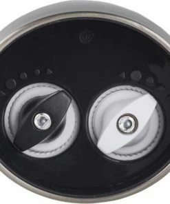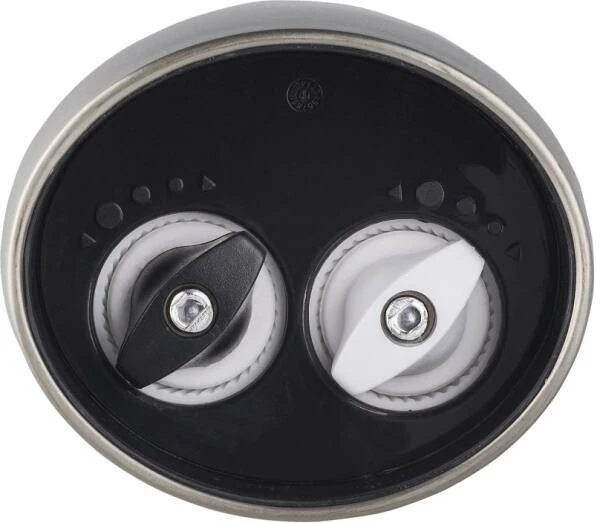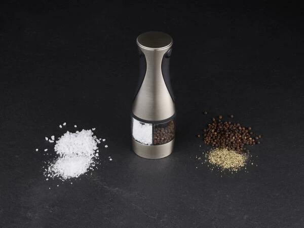 Mahlen von Pfeffer und Salz mit nur einer Mühle. Kew ist eine elektrische Pfeffer- und Salzmühle in Einem. Bietet ein einzigartiges platzsparendes und batteriesparendes Design für diejenigen, die frisch gemahlenes Salz und Pfeffer geniessen. Obwohl es kompakter ist als zwei separate Mühlen, geht es keine Kompromisse bei der Leistung ein. Mit zwei diamantscharfen Keramikmahlwerken für präzises und gleichmässiges Mahlen bei jeder Drehung. Aufgrund der strapazierfähigen Eigenschaften des Mechanismus können Sie sicher sein, dass Sie über Jahre hinweg eine konstant hervorragende Leistung erzielen. Füllen Sie die Mühle sowohl mit Ihrem bevorzugten groben Meer- oder Steinsalz als auch mit ganzen Pfefferkörnern. Entfernen Sie den halbtransparenten Deckel, der jedes Fach abdeckt, und füllen Sie ihn bis zum Rand. Zum Einlegen von Batterien sollte die Mühle auf die gleiche Weise geöffnet werden. Es werden 6 AAA-Batterien (nicht im Lieferumfang enthalten) benötigt. Für die beste Leistung werden Alkalibatterien empfohlen. Wenn Sie mit der Verwendung beginnen möchten, können Sie die Bedienung einfach durchführen, indem Sie die entsprechenden Tasten auf beiden Seiten gedrückt halten. Halten Sie die Taste gedrückt, bis Sie die gewünschte Gewürzmenge erreicht haben, und halten Sie dann die andere Taste gedrückt. Jeder Knopf befindet sich in einem Soft-Touch-Bedienfeld, so dass er leicht im Alleingang gehalten und bedient werden kann. Er eignet sich hervorragend zum Mahlen über einer Pfanne, während noch gerührt wird. Die Mahlgradgrösse kann mit den Knöpfen am Boden der Mühle von fein bis grob eingestellt werden. Jeder Knopf kann separat eingestellt werden. Für einen feineren Mahlgrad den Knopf festziehen. Dies ist ideal für Suppen und Saucen. Ein gröberer Mahlgrad eignet sich hervorragend für Steaks. Lösen Sie einfach den Knopf, bis Sie die gewünschte Einstellung erreicht haben.