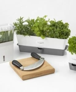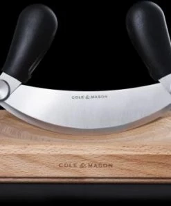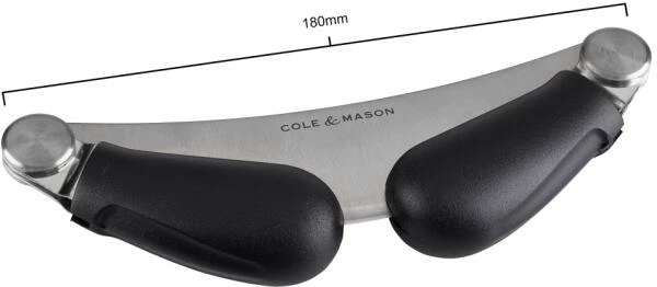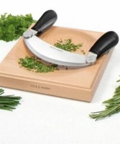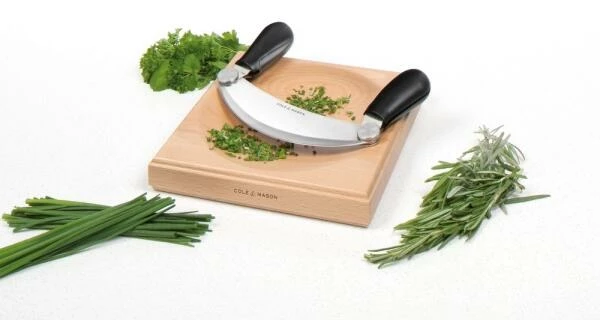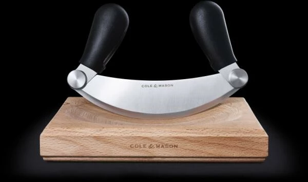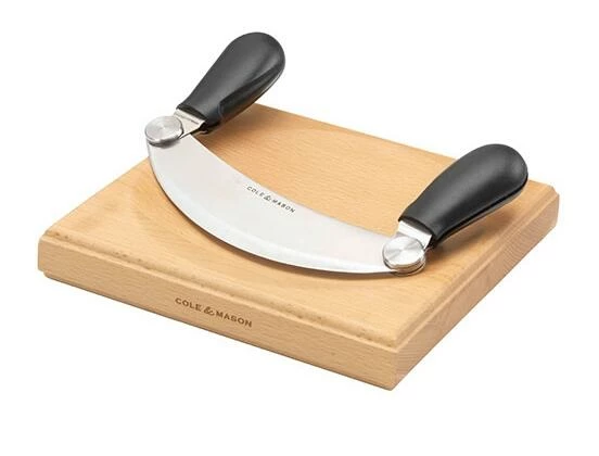 Kräuterschneiden leicht gemacht mit dem praktischen Wiegemesser und passendem Schneidebrett von Cole & Mason. Die geschwungene Klinge des Messers ist perfekt an die Form des Brettes angepasst und erleichtert so das Kräuterschneiden. Das Holzbrett ist beidseitig verwendbar, etwa als Servierplatte. Die Klappgriffe des Wiegemessers sind für eine einfache Handhabung frei beweglich und können als Klingenschutz eingeklappt werden. Das Wiegemesser ist spülmaschinengeeignet. Ein perfektes Geschenk für jeden stilbewussten Koch.