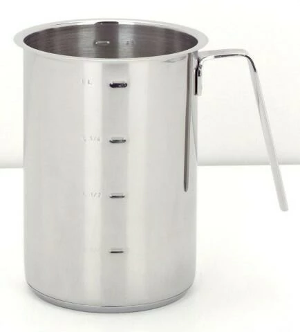 Demeyere! Dank der 3-Schichtenboden von 3,5 mm kann er auf jedem Herdtyp gebraucht werden, inklusive Induktion, und dies zum kochen und um warm zu halten. Ausserdem können Sie darin mixen ohne zu spritzen. Mit handlichem Griff, Maßanzeigen und perfektem Giessrand. Aus Edelstahl 18/10.