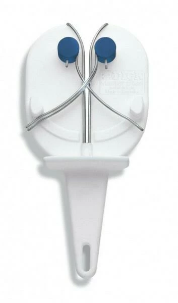 Der Master Steel kann als Handgerät oder als Tischgerät im Halter verwendet werden. Denn als Zubehör kann eine variabel nutzbare Halterung, die ohne Spezialwerkzeug und sehr einfach am Arbeitsplatz anzuschrauben ist, erworben werden. Der Halter bietet die Möglichkeit, dass der Messerschärfer in drei verschiedene Stellungen, frontal oder mit linker bzw. rechter Ausrichtung, gesteckt werden kann. Dadurch lässt er sich optimal in den Arbeitsablauf integrieren und kann immer dem Anwender zugewandt positioniert werden. Das Loch im Griffende des Master Steels ermöglicht, dass das Gerät angekettet oder im Halter mit einem Schloss diebstahlsicher angeschlossen werden kann. Den Master Steel in der Farbe Weiß gibt es in zwei Ausführungen: