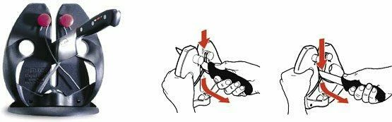Und so einfach funktioniert der Messerschärfer Master Steel: Das Messer mit leichtem Druck bogenförmig durch den Spalt des Schärfegerätes ziehen. Nicht nach unten drücken und dann erst durchziehen. Mehrmals wiederholen und schon haben Sie ein scharfes Messer.