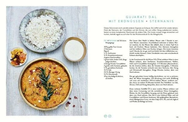 Von Klassikern wie Dals, Curries und Samosas über neue Kreationen wie Kebabs aus roter Bete oder Kürbis bis hin zu delikaten Desserts wie Möhren-Halwa und Pistazien-Mandel-Kuchen – hier wurden originale Familienrezepte mit modernen Einflüssen verfeinert und perfektioniert. Das Ergebnis sind kreative indische Gerichte, die gleichermaßen innovativ wie authentisch sind. Die überall erhältlichen Zutaten tragen zur Alltagstauglichkeit der Rezepte bei und sorgen dafür, dass sie sich schnell und einfach zubereiten lassen.