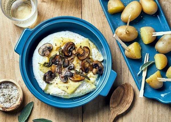 Ob Brie, Mozzarella oder Ziegenkäse: Legen Sie einfach den Käse in den Baker, fügen Sie süße oder herzhafte Beilage hinzu, schließen Sie den Deckel und stellen Sie ihn in den Ofen. Nach dem Backen direkt darin servieren.