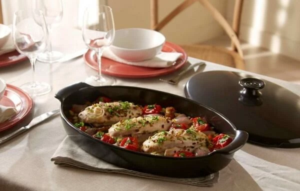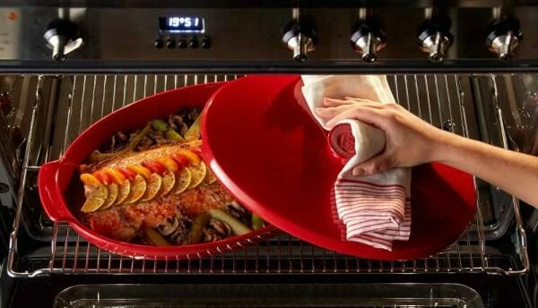 Emile Henry Papilloteform in fusain. Gesundes Garen von Fisch und mehr samt Beilagen.