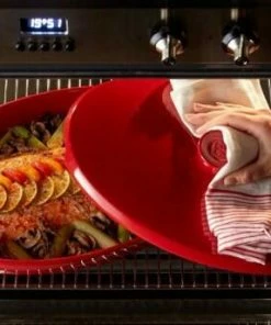 Mit der Papilloteform von Emile Henry werden Sie bald noch gesünder kochen. Ohne Fett hinzuzufügen können Sie mit der Form Fisch oder Fleisch im Ganzen samt Gemüsebeilagen garen. Die hochresistente Ofenkeramik von Emile Henry ist dabei geschmacksneutral und hält das Essen auch beim Servieren zu Tisch lange warm. Zusätzlich sorgen die Rillen am Boden der Papilloteform dafür, dass das Gargut etwas erhöht liegt und vermeidet so übermäßiges Garen. Die Form ist dank den Griffen außerdem leicht zu tragen, lässt sich mit umgedrehten Deckel platzsparend verstauen und einfach in der Spülmaschine reinigen.