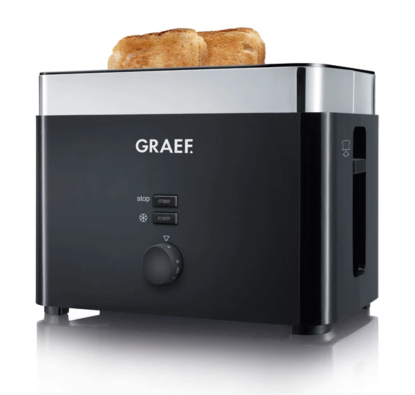 Graef mit wärmeisoliertem Kunststoffgehäuse ist geeignet für zwei Toastscheiben. Sie können zwischen sechs Röstgraden wählen, es gibt eine Stopp- wie auch Auftau-Taste und einen integrierten Brötchenaufsatz. Die Nachhebevorrichtung für die bessere Entnahme des Göstgutes und die Krümelschublade sind weitere funktionale Details. Die rutschfesten Gummifüße und die Automatikabschaltung bei Verklemmen des Röstgutes machen den Toaster von Graef zu einem Produkt für Sicherheit in Ihrem Alltag. Der Toaster ist sowohl für normales Toastbrot, als auch für großes American Sandwich Toastbrot geeignet.