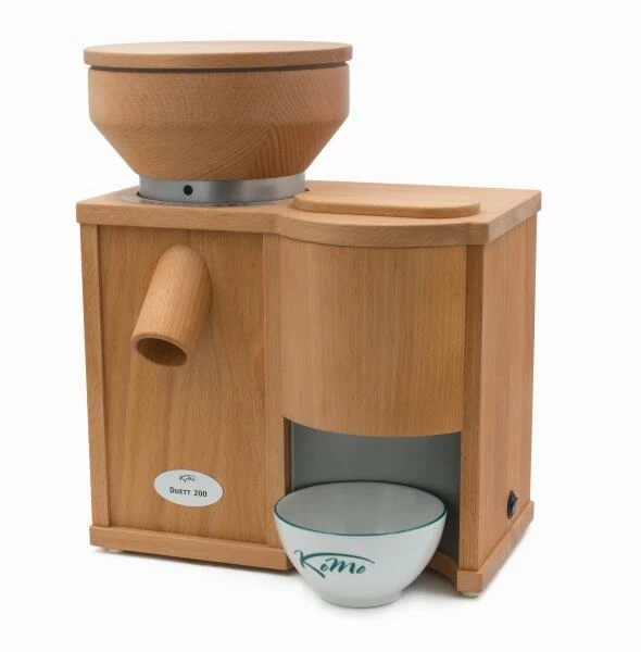 Hier geht alles Hand in Hand: Frisch gemahlen und geflockt. Das Designer-Meisterstück KoMo Duett ist schlicht ein Alleskönner: Zwei Antriebe, die optimal eingestellt sind und unabhängig voneinander arbeiten, gerne auch zur gleichen Zeit. So kann der Tag beginnen: Morgens frische Flocken, mittags feines Mehl für den Kuchen und dazu gleich noch Mohn gequetscht. In der KoMo Duett 100 sind die solide KoMo Fidibus Classic und der geräuscharme KoMo FlocMan locker flockig eine dauerhafte Bindung miteinander eingegangen. Mit der strapazierfähigen Technik der Fidibus XL auch unter dem Namen Duett 200 erhältlich. Lieferung erfolgt mit einer passenden handgefertigten Keramikschale. Im Preis unschlagbar – denn das Ganze kostet weniger als die Summe seiner Teile.