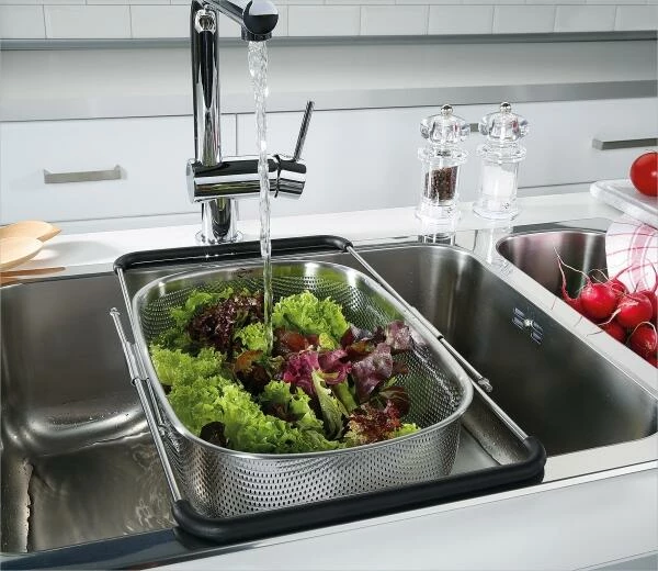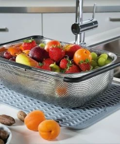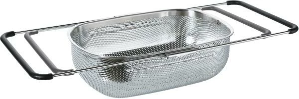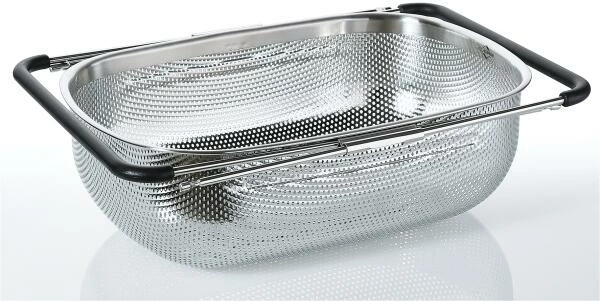 Küchenprofi Gemüsesieb DELUXE. Das praktische Sieb mit ausziehbaren Griffen passt auf nahezu alle Spülbecken. Das Sieb ist ein vielseitiger Küchenhelfer und ideal zum Abgießen von Flüssigkeiten aus dem Kochtopf oder zum Abwaschen von Obst, Gemüse und mehr. Der rostfreie Edelstahl ist geruchs- und geschmacksneutral. Die Griffe aus hochwertigem Kunststoff bieten eine rutschfeste Auflage und einen sicheren Halt.