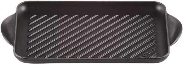 Gusseisen in schwarz. Die große rechteckige Fläche eignet sich ideal zum Grillen von Hähnchen, Steaks, Fisch und Gemüse.