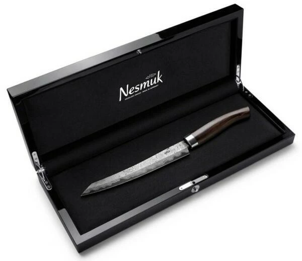 Nesmuk verbindet traditionsreiche Handwerkkunst mit modernster Technologie. Das Unternehmen aus Solingen entwickelt und fertigt Messer in höchstmöglicher Schärfe und setzt dabei auf Stahlsorten, Edel-Materialien und Technologien, die in der Schneidwarenindustrie noch nie zuvor verwendet worden sind – und genau das macht den Unterschied! Alle Messer werden unter dem Anspruch gefertigt, in ihrer Schärfe nicht überboten werden zu können und in jedem Anwendungsbereich den feinstmöglichen Schnitt zu ermöglichen. Die Produkte entstehen in mühevoller, mehrjähriger Detail-Arbeit. Alle Produkte sind mit praktischen und dekorativen Alleinstellungsmerkmalen ausgestattet und genießen den Ruf, jeweils die Besten in ihrer Kategorie zu sein! Sie sind zeitlos, funktional und von höchster Qualität. Es macht keinen Unterschied, ob das Messer links- und rechtshändig geführt wird. Zusätzlich bietet Nesmuk eine Vielzahl an praktischen Zubehör zum Schärfen, Aufbewahren, Pflege sowie Arbeiten wie z.B. Streichriemen, Messerhalter und Schneidbretter an.