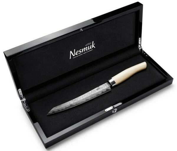 Nesmuk verbindet traditionsreiche Handwerkkunst mit modernster Technologie. Das Unternehmen aus Solingen entwickelt und fertigt Messer in höchstmöglicher Schärfe und setzt dabei auf Stahlsorten, Edel-Materialien und Technologien, die in der Schneidwarenindustrie noch nie zuvor verwendet worden sind – und genau das macht den Unterschied! Alle Messer werden unter dem Anspruch gefertigt, in ihrer Schärfe nicht überboten werden zu können und in jedem Anwendungsbereich den feinstmöglichen Schnitt zu ermöglichen. Die Produkte entstehen in mühevoller, mehrjähriger Detail-Arbeit. Alle Produkte sind mit praktischen und dekorativen Alleinstellungsmerkmalen ausgestattet und genießen den Ruf, jeweils die Besten in ihrer Kategorie zu sein! Sie sind zeitlos, funktional und von höchster Qualität. Es macht keinen Unterschied, ob das Messer links- und rechtshändig geführt wird. Zusätzlich bietet Nesmuk eine Vielzahl an praktischen Zubehör zum Schärfen, Aufbewahren, Pflege sowie Arbeiten wie z.B. Streichriemen, Messerhalter und Schneidbretter an.