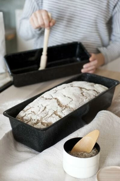 Riess Brotbackform aus Emaille. Die längliche Backform mit Bördelrand ist ideal für Brot, Kuchen, Pasteten und Parfait. Die Backform ist 35 cm lang und 14 cm breit. Emaille ist besonders langlebig und mit porenloser Oberfläche besonders glatt.