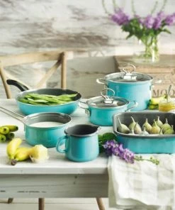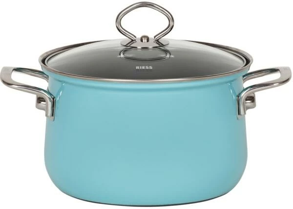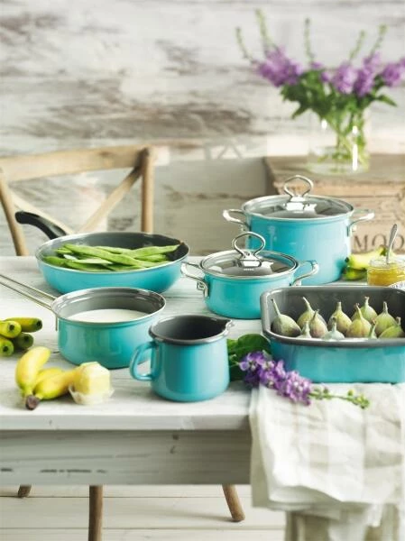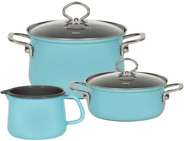 Riess Geschirr-Set aus Emaille, 3-tlg. in kristallblau. 2 Töpfe und 1 Schnabeltopf aus Emaille, Edelstahl und Glas.