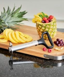 Mit dem Ananasschneider von RÖSLE lassen sich Ananasringe im Nu perfekt zubereiten. In nur wenigen Schritten wird das Beste aus der Frucht herausgeholt: Zunächst wird die Ananas zwei bis drei Zentimeter unter dem Blätterschopf abgeschnitten. Der Ananasschneider lässt sich dann sehr leicht von oben in die Frucht eindrehen. Der ergonomische Griff bietet optimalen Halt und garantiert einen mühelosen Drehvorgang. Am Boden der Ananas angekommen, lässt sich das Fruchtfleisch – mittlerweile perfekt getrennt vom Strunk – einfach herausziehen. Das Ergebnis sind servierfertige, dekorative Ananasringe, die nicht nur den Gaumen, sondern auch das Auge erfreuen.