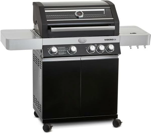 Rösle Gasgrill BBQ-Station VIDERO G4 in schwarz (Modelljahr 2021). Gasbetriebener VIDERO G4 BBQ-Grill mit 4 Hauptbrennern, komfortabler Haupt-Grillfläche, Warmhalterost, Seitenbrenner, beleuchteten Drehknöpfen, Deckelthermometer, Gasdruckregler u.v.m.