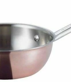 Schulte-Ufer De Luxe i vereint die Materialien Kupfer, Aluminium, Edelstahl auf schönste und intelligenteste Weise: Die äußere Kupferschicht sorgt für eine schnelle Wärmeverteilung (kein anderes Material leitet die Wärme besser als Kupfer), der Aluminiumkern in der Mitte dient der Wärmespeicherung und der rostfreie Edelstahl im Inneren ermöglicht lebensmittelechtes Kochen und Braten.