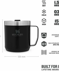 Der Stanley CLASSIC CAMP MUG im neuen Design hält mit seiner doppelwandigen Edelstahl-Vakuumisolierung heiße Getränke bis zu 1,5 Stunden heiß und kalte Getränke bis zu 3 Stunden kalt. Neu ist, dass der aus rostfreiem 18/8-Edelstahl hergestellte Trinkbecher jetzt einen durchsichtigen Deckel aus bruchfestem Tritan-Kunststoff besitzt, aus den es sich noch bequemer trinken lässt. Der mit mattschwarzer Lackierung versehene CLASSIC CAMP MUG ist spülmaschinenfest und alle Teile sind BPA-frei.