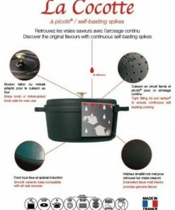 - Effizientes, selbständiges Begießen der Speisen durch das Noppensystem auf der Deckelunterseite; die spezifische Form des Deckels, sein Gewicht und die Noppen sorgen dafür, dass die Feuchtigkeit nicht aus dem Staub Bräter entweicht.