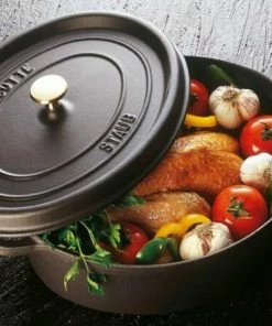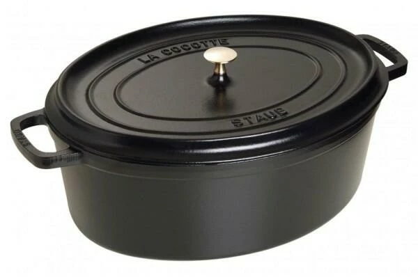Eigenschaften des Staub Bräter bzw. Cocotte oval aus Gusseisen in schwarz:
