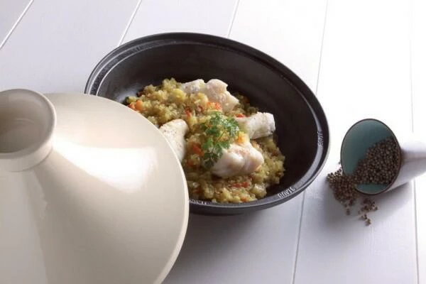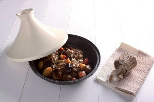Fleisch, Hühnchen, Fisch und Gemüse werden darin im eigenen Saft, schonend und fettarm gegart. Die Tajine ermöglicht ein einzigartiges Geschmackserlebnis, bei dem die Nährstoffe weitgehend erhalten bleiben.