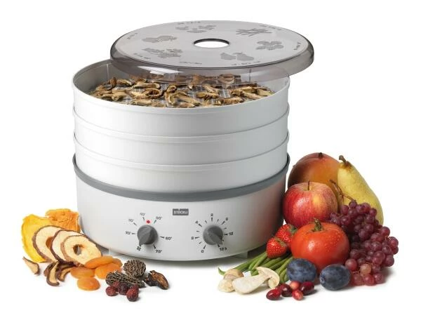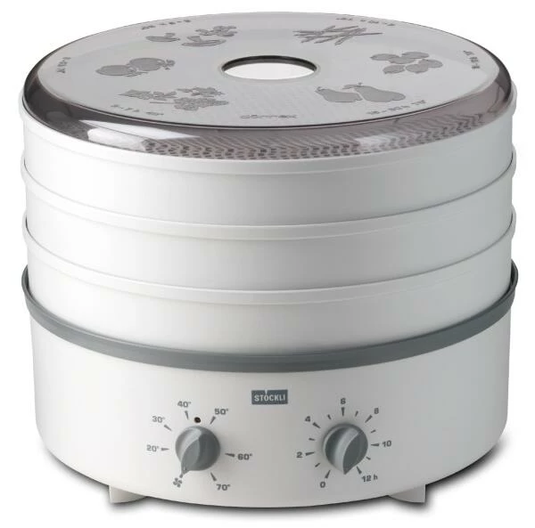 Stöckli Dörrautomat dörrex mit Timer und Kunststoffgitter. Hochwertiger Dörrautomat mit Zeitschaltuhr und drei Kunststoff-Dörrgittern.