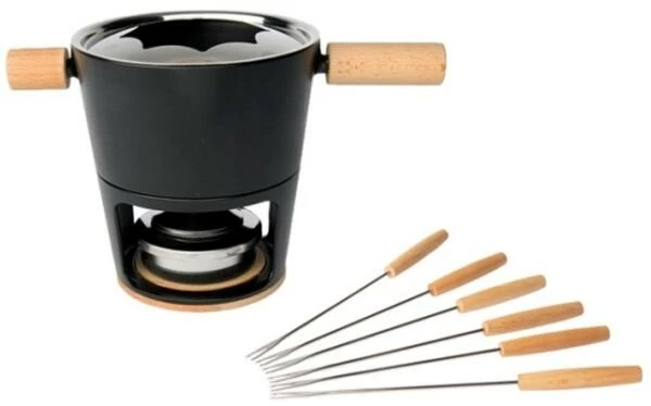 Stöckli Fonduegarnitur Titlis. Induktionsfähiger Gusseisentopf – geeignet für 6 Personen bei Fleischfondue und 2-3 Personen bei Käsefondue. Inklusive 6 Fleischfonduegabeln mit Holzgriff. Wenn es nicht benutzt wird, kann das Fondue kompakt und platzsparend verstaut werden.
