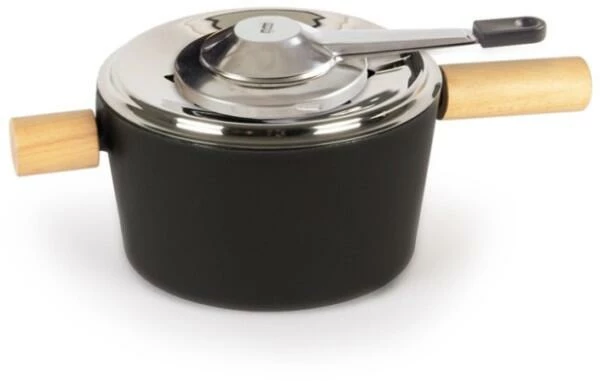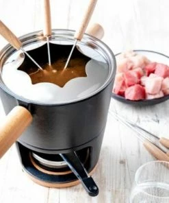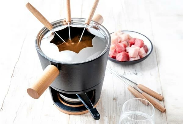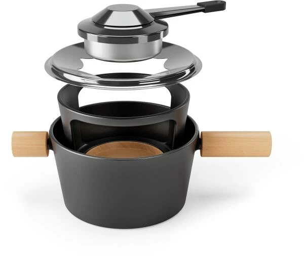 Die Fonduegarnitur von Stöckli besteht aus einem robusten, schwarzen Gusseisentopf mit Spritzschutz. Das Rechaud mit einem Holzsockel verfügt über einen Pasten-Sicherheitsbrenner. Das Fassungsvermögen von 1,8 l ist ideal für eine kleine bis mittlere Runde Fleisch-, Fisch- oder Käsefondue.