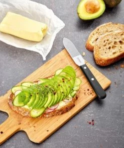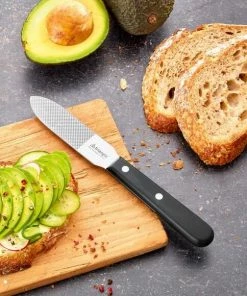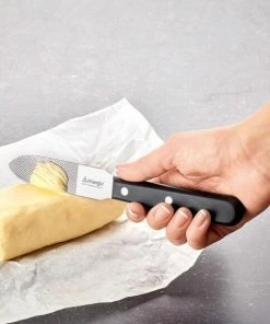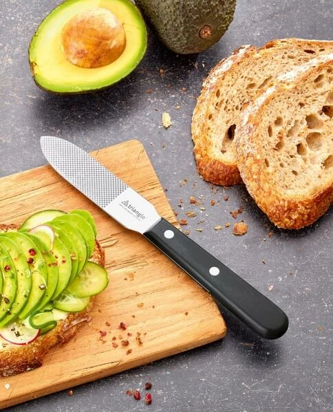 Das Aufstrichmesser kommt aus der Gastronomie und hat eine breite, sehr flexible Klinge. Es ist weniger zum Schneiden geeignet sondern dient dazu, Brotaustriche und Butter schnell und gleichmäßig zu verteilen. Die Gitterätzung bewirkt eine rauhe Oberfläche und sorgt für besondern gute Haftung der Butter am Messer. Das Aufstrichmesser besteht aus Edelstahl und einem ABS Griff. Dieser wird per Hand gereidet, ausgemacht und genietet. Aufgrund der unterschiedlichen Materialien wird die Reinigung per Hand empfohlen. Rostfrei. Hergestellt in Solingen/Deutschland.