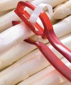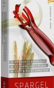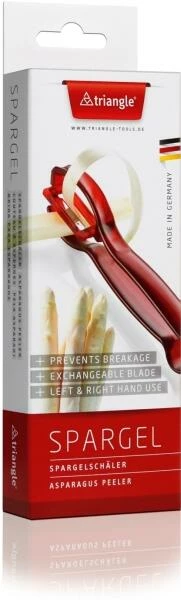 Der Spargelschäler überzeugt durch seine einzigartige Spezialklinge, entwickelt aus den Erfahrungen als Klingenhersteller für professionelle Spargelschälautomaten. Die aus gehärtetem rostfreiem Stahl gefertigte Klinge mit rasierklingenscharfem Polierabzug ist so geformt, dass sich Spargelfasern schnell und einfach auswaschen lassen. Einfach in einer bereitgestellten Schale Wasser ausschwenken und die Klinge ist wieder einsatzbereit. Ein kleiner Abweiser verhindert, dass sich die Schale nach dem Schälvorgang wieder auf den Spargel legt. Da sich die Klinge einfach umgestecke lässt, eignet sich der Spargelschäler für Links- und Rechtshänder gleichermaßen.Die zangenartige Form unterstützt die Stange und verhindert Spargelbruch.Klinge aus gehärtetem, rostfreien Stahl und bei Bedarf auswechselbar. Made in Solingen, spülmaschinengeeignet.