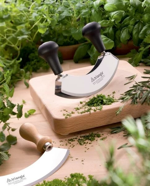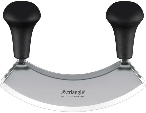 Mit Wiegemessern können schnell und einfach Kräuter, Nüsse, Knoblauchzehen etc. fein oder grob gehackt werden. Die beiden ergonomisch geformten Handgriffe sorgen für eine sichere Handhabung und optimale Kraftübertragung und ermüdungsfreies Arbeiten sind gewährleistet. triangle Wiegemesser werden in Handarbeit hergestellt und sorgfältig am Schleifband geschärft. Daher sollten Wiegemesser auch vorsichtig und per Hand unter fließendem Wasser gereinigt werden. Modelle mit Kunststoffgriff dürfen aber auch gelegentlich in die Spülmaschine. Vollständig hergestellt in Solingen/ Deutschland. Tipp:Kleine und mittelgroße Modell mit 14 cm oder 18 cm sind besonders handlich. Große Modelle mit 23 cm arbeiten besondern schnell und sind auch ideal zum Zerteilen von Pizza und Blechkuchen geeignet.Während zweischneidige Wiegemesser besonders schnell arbeiten, lassen sich einschneidige Modelle präziser führen und besonders leicht reinigen.