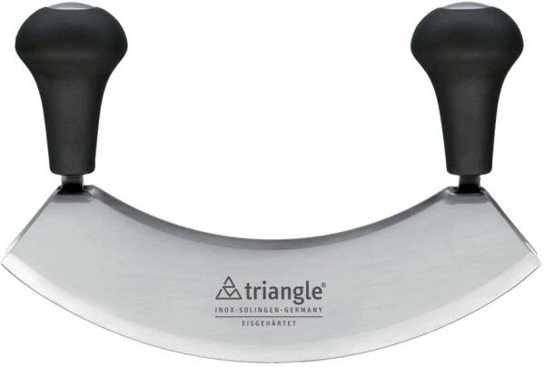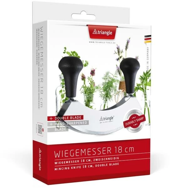 Mit Wiegemessern können schnell und einfach Kräuter, Nüsse, Knoblauchzehen etc. fein oder grob gehackt werden. Die beiden ergonomisch geformten Handgriffe sorgen für eine sichere Handhabung und optimale Kraftübertragung und ermüdungsfreies Arbeiten sind gewährleistet. Die besonders hochwertige, gehärte Klinge bleibt dauerhaft scharf und ist bei Bedarf nachschleifbar. triangle Wiegemesser werden in Handarbeit hergestellt und sorgfältig am Schleifband geschärft. Daher sollten Wiegemesser auch vorsichtig und per Hand unter fließendem Wasser gereinigt werden. Modelle mit Kunststoffgriff dürfen aber auch gelegentlich in die Spülmaschine. Vollständig hergestellt in Solingen/ Deutschland. Tipp:Kleine und mittelgroße Modell mit 14 cm oder 18 cm sind besonders handliche. Große Modelle mit 23 cm arbeiten besondern schnell und sind auch ideal zum Zerteilen von Pizza und Blechkuchen geeignet.Während zweischneidige Wiegemesser besonders schnell arbeiten, lassen sich einschneidige Modelle präziser führen und besonders leicht reinigen.