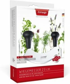 Mit Wiegemessern können schnell und einfach Kräuter, Nüsse, Knoblauchzehen etc. fein oder grob gehackt werden. Die beiden ergonomisch geformten Handgriffe sorgen für eine sichere Handhabung und optimale Kraftübertragung und ermüdungsfreies Arbeiten sind gewährleistet. Die besonders hochwertige, gehärte Klinge bleibt dauerhaft scharf und ist bei Bedarf nachschleifbar. triangle Wiegemesser werden in Handarbeit hergestellt und sorgfältig am Schleifband geschärft. Daher sollten Wiegemesser auch vorsichtig und per Hand unter fließendem Wasser gereinigt werden. Modelle mit Kunststoffgriff dürfen aber auch gelegentlich in die Spülmaschine. Vollständig hergestellt in Solingen/ Deutschland. Tipp:Kleine und mittelgroße Modell mit 14 cm oder 18 cm sind besonders handliche. Große Modelle mit 23 cm arbeiten besondern schnell und sind auch ideal zum Zerteilen von Pizza und Blechkuchen geeignet.Während zweischneidige Wiegemesser besonders schnell arbeiten, lassen sich einschneidige Modelle präziser führen und besonders leicht reinigen.