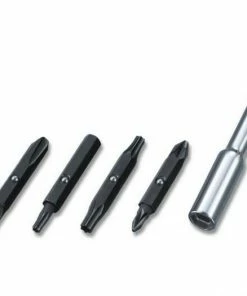 - 32 Funktionen: 1. Klinge, gross, 2. Klinge, klein, 3. Korkenzieher, 4. Mini-Schraubendreher, 5. Stech-, Bohr- und Nähahle, 6. Dosenöffner, 7. Schraubendreher 3 mm, 8. Kapselheber, 9. Schraubendreher 5 mm, 10. Drahtabisolierer. 11. Bit Schlitz 4 mm, 12. Bit Phillips 0 (Pozidrive), 13. Bit Phillips 1 (Pozidrive), 14. Bit Phillips 2, 15. Bit Torx 10, 16. Bit Torx 15, 17. Bit-Schraubenzieher, 18. Bit Torx 8, 19. Innensechskant für Bits 4 mm, 20. Innensechskant für D-SUB-Steckverbinder 5 mm, 21. Ring, 22. Zahnstocher, 23. Pinzette, 24. Druckkugelschreiber, 25. Stecknadel, rostfreier Stahl, 26. Zange, 27. Drahtbieger, 28. Hülsenpresser, 29. Schere, 30. Mehrzweckhaken, 31. Mini-Schraubendreher, 32. Korkenzieher, 33. Bit Schlitz 4 mm, 34. Bit Phillips 2, 35. Bit Phillips 0 (Pozidrive), 36. Bit Phillips 1 (Pozidrive), 37. Bit Torx 10, 38. Bit Torx 15, 39. Bit Torx 6, 40. Bit Torx 8, 41. Bit Hex 1,2, 42. Bit Hex 1,5, 43. Innensechskant für D-SUB-Steckverbinder 5 mm, 44. Innensechskant für Bits 4 mm, 45. Bit Hex 2, 46. Bit Hex 2,5, 47. Bit Hex 4 (Inbus), 48. Bit Torx 8