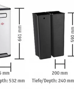 Der Abfalltrenner Big Double Master aus dem Hause Wesco passt dank seiner schmalen Form perfekt in jede Ecke oder Winkel. Die zwei getrennten Kunststoffeinsätze mit je 20 Liter Füllmenge sorgen für die ordnungsgemäße Trennung von Papier, Glas, Kunststoff oder Restmüll. Der Edelstahldeckel ist zweigeteilt und schließt dank eines eingebauten Dämpfers nahezu geräuschlos. Er kann in der offenen Stellung arretiert werden. Eine problemlose Bedienung der Öffnung wird durch den großzügigen Fußtritt aus Edelstahl gewährleistet. Unter dem Behälter befinden sich zwei Rollen, so dass der Abfallsammler mühelos bewegt werden kann.
