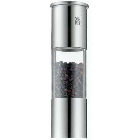 WMF Pfeffermühle. Das Keramikmahlwerk ist bei dieser Metallmühle oben und ist mit einem Deckel verschlossen. Dadurch bleibt Ihr Tisch sauber, denn nichts kann aus der Mühle krümeln. WMF verfügt über eine große Auswahl an Salz- und Pfeffermühlen in verschiedenen Materialausführungen und Größen. Ob in Buchenholz, Acrylglas oder Ganzmetall, für jeden Geschmack ist etwas dabei.