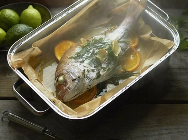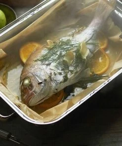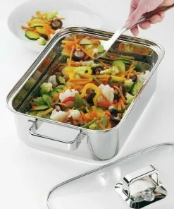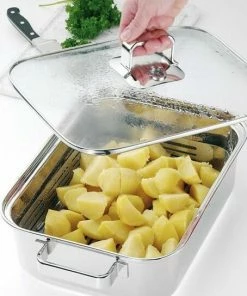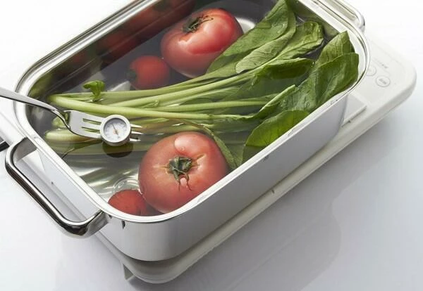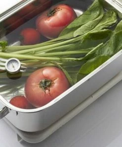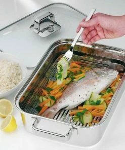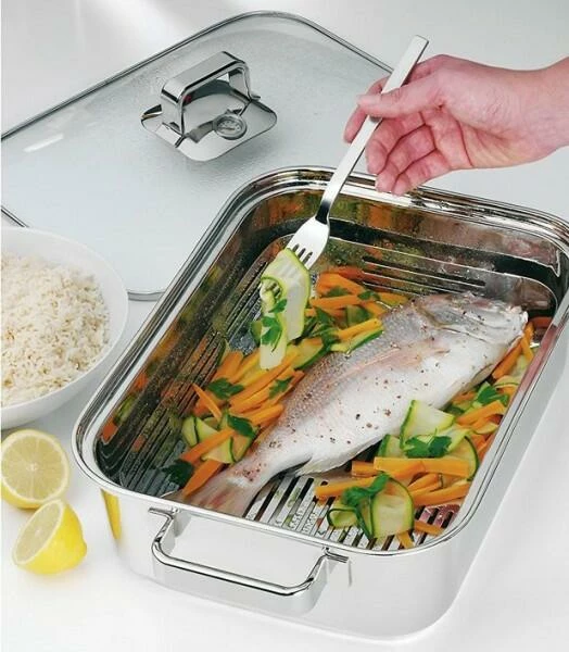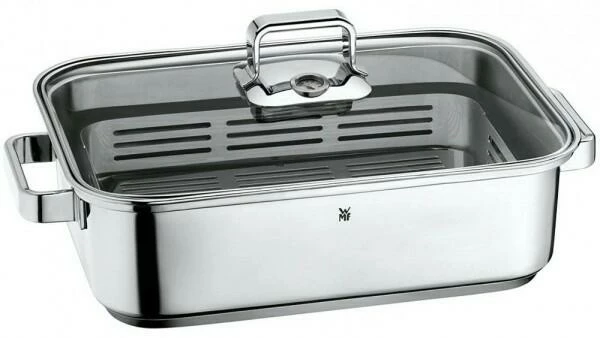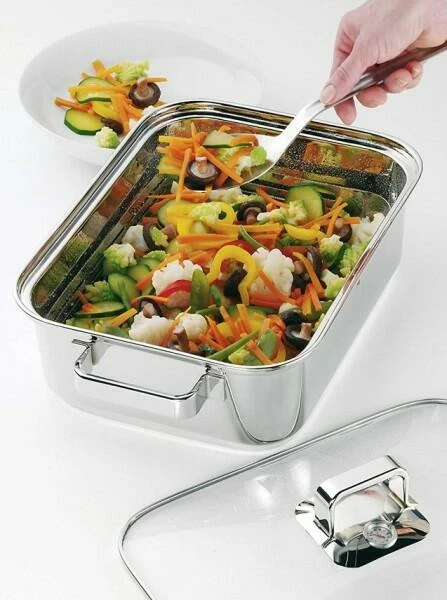 Deraus rostfreien Edelstahl bestehende Dampfgarer Vitalis von WMF mit Kaltgriffen und einen TransTherm-Allherdboden ist ein geschlossenes System für den Herd. In das rechteckige Unterteil des Dampfgarer einfach eine kleine Menge Wasser oder Fond geben und die Zutaten nebeneinander auf das Garblech legen. Der mitgelieferte Glasdeckel schließt die kleine Garküche luftdicht ab. Das integrierte Thermometer misst zuverlässig die Temperatur. Das Wasser beginnt zu sieden, Dampf steigt auf. Fisch, Fleisch und Gemüse werden schonend gegart, ohne mit dem Wasser in Berührung zu kommen. Zusätzlich wird das Anbrennen oder Austrocknen der Zutaten verhindert und im Dampf bleiben die Vitamine weitgehend erhalten.