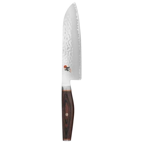 Das Santokumesser von Miyabi hat eine Härte von ca. 63 Rockwell und ist ideal zum Schneiden von Fleisch, Fisch und Gemüse. Der dunkle Holzgriff liegt dank seiner ergonomischen Form gut in der Hand und erlaubt ein müheloses Schneiden. Die Klinge überzeugt durch ihr Muster sowie durch die schnitthaltigen, langlebigen und robusten Eigenschaften. Der Hersteller hat auf ein authentisch-japanisches Klingenprofil geachtet, das mit Hammerschlag-Optik verziert wurde.