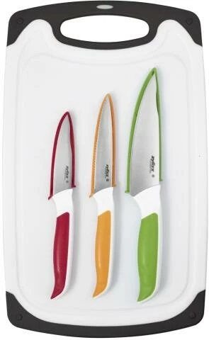 Komplettes Schneidset mit Schneidebrett, Schälmesser, gezahntem Schälmesser und Allzweckmesser